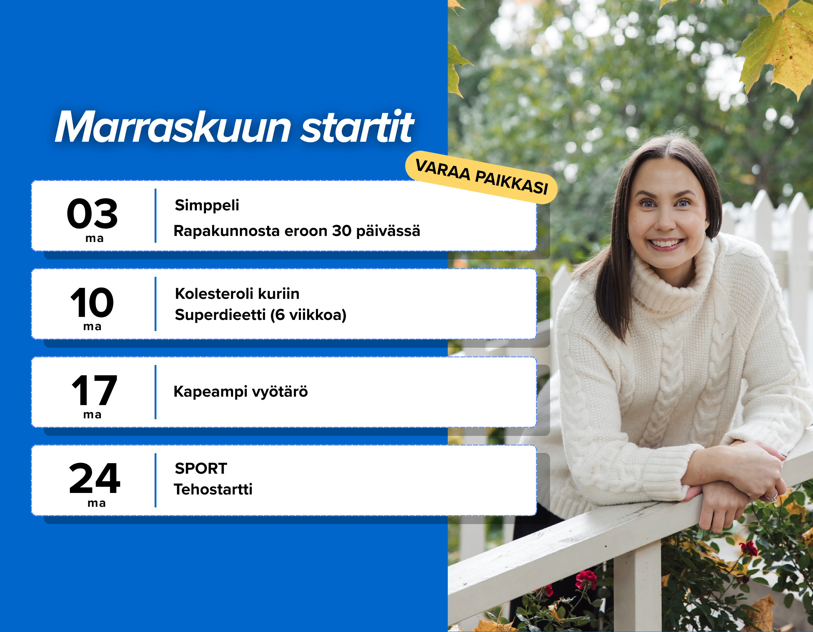 [fa-regular fa-calendar-star][color#0066cc][bg#ffffff] Rapakunnosta eroon 30 päivässä alkaa ma 3.11.