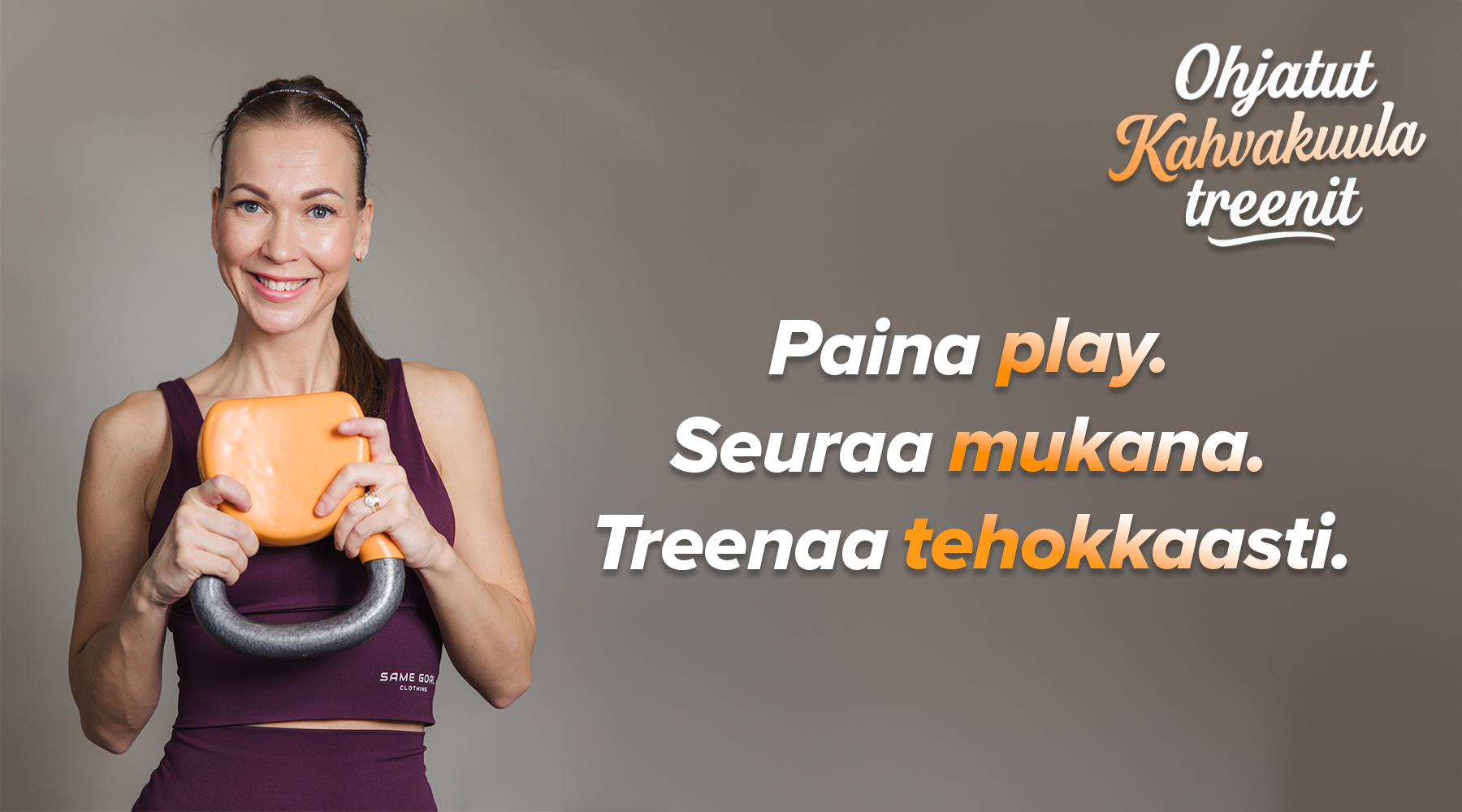 Treeni on helppo aloittaa: valitse harjoitus, paina play ja seuraa mukana. Jokaisessa treenissä käydään läpi liikkeiden tekniikka, turvalliset suoritusohjeet sekä vinkit kuorman säätämiseen omille voimatasoille sopivaksi. Tarvitset vain yhden tai kaksi eripainoista kahvakuulaa – ja halutessasi voit tehdä treenit täysin kotona.